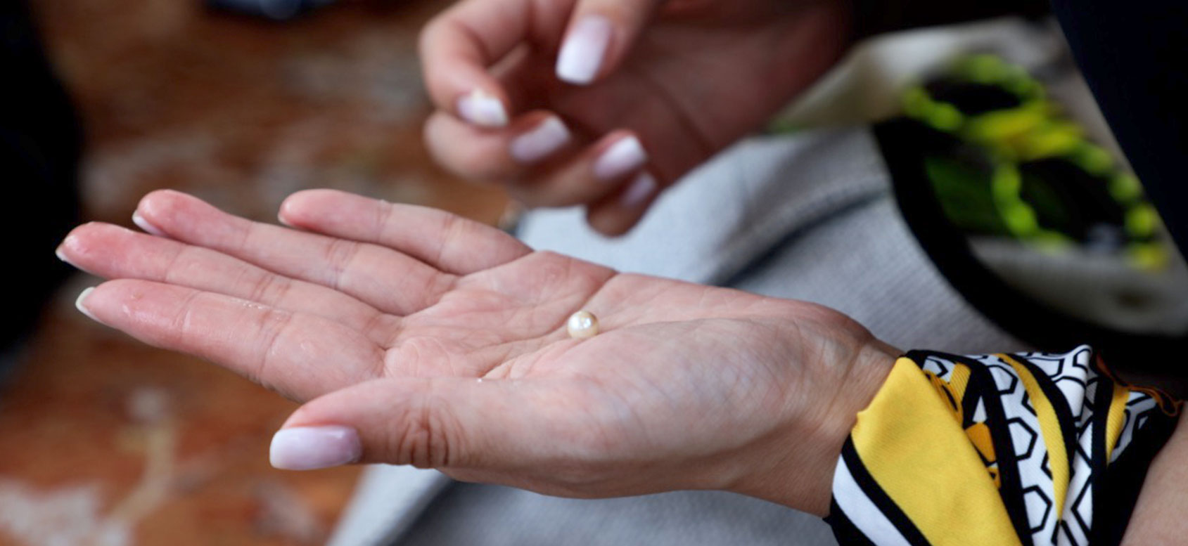 Each guest is given the chance to search for a pearl after we open the seashell in front of them with the oyster knife (oyster opener tool). Every guest will be searching the seashells until they find the pearl. Each guests will discover his/her own pearl because we make sure that we have enough seashells that are with pearls. So in case a guest doesn’t find a pearl in the first seashell that they open then they will receive another seashell till they find their pearl.